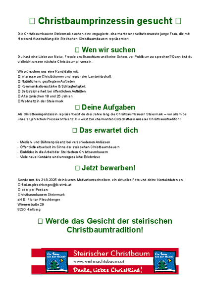 Die Christbaumbauern Steiermark suchen eine engagierte, charmante und selbstbewusste junge Frau, die mit Herz und Ausstrahlung die Steirischen Christbaumbauern repräsentiert.